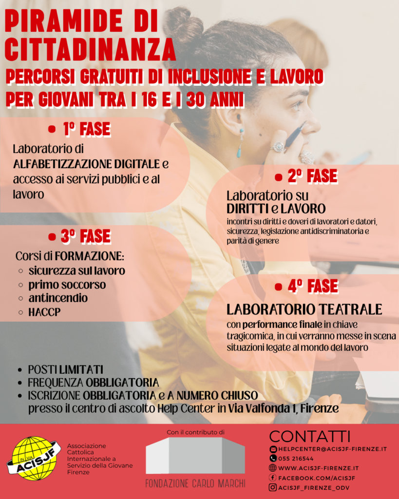 Costruire solide basi per il futuro, partendo dalle competenze digitali fino alla consapevolezza dei propri diritti, passando per la sicurezza sul lavoro e l’espressione creativa del teatro. È questo l’obiettivo di “Piramide di Cittadinanza”, l’innovativo progetto lanciato da ACISJF Firenze ODV e realizzato grazie al contributo della Fondazione Carlo Marchi.